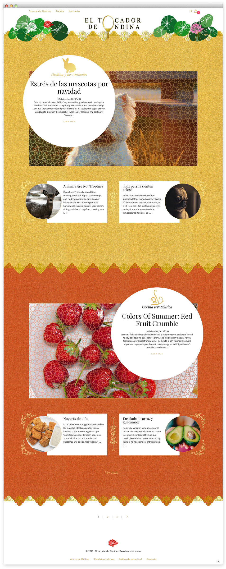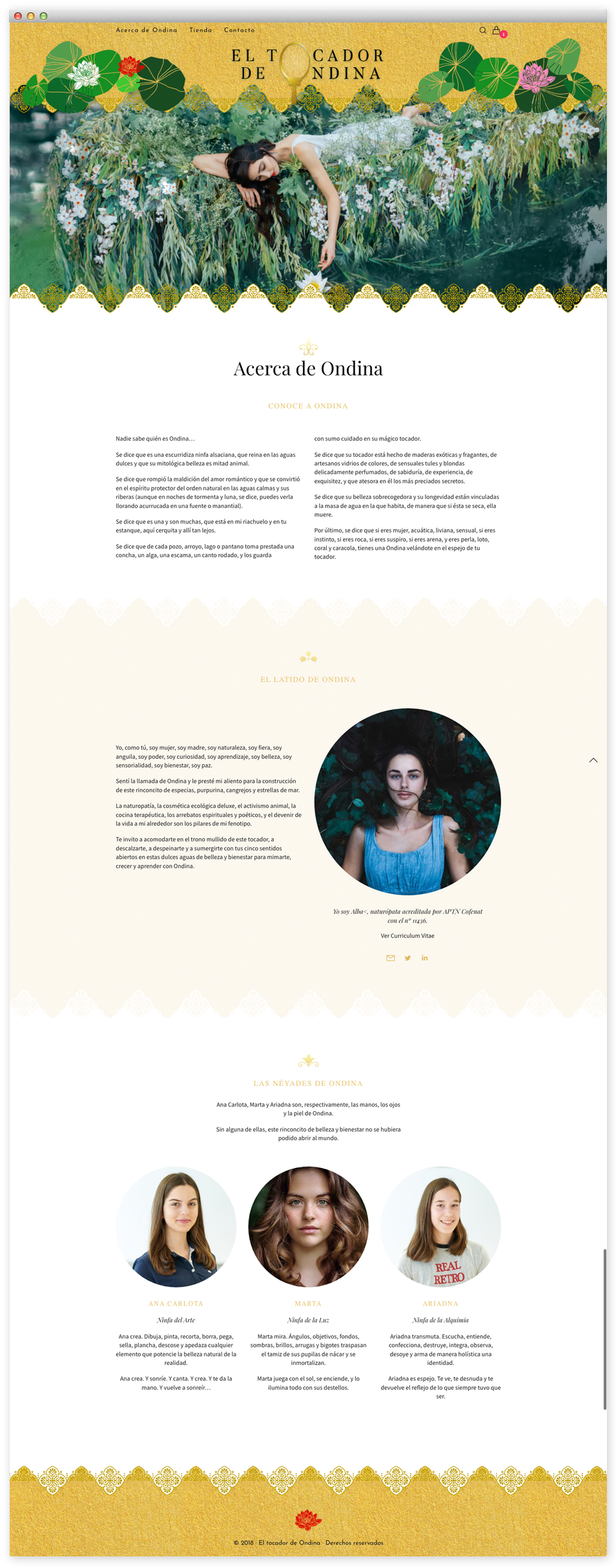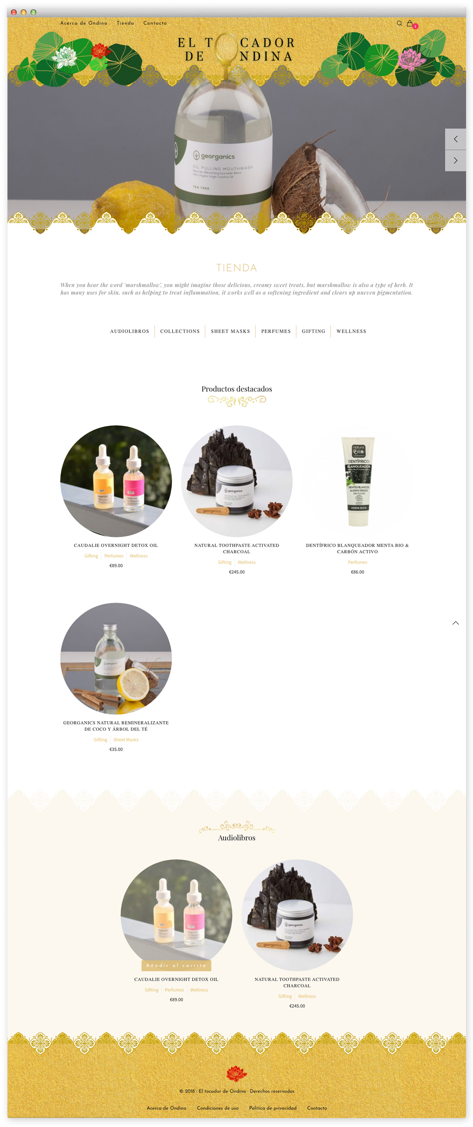 Disseny i acompanyament poètic pel preciós projecte d’e-commerce “El tocador de Ondina”, amb el que hem aconseguit quelcom impossible i al mateix temps imprescindible per al client: una página web daurada, lleugera como el pa d’or, intensa com les espècies de la Índia i màgica com les ninfes d’aigua. Un somni delicat i vibrant. Branding, disseny i desenvolupament web.
