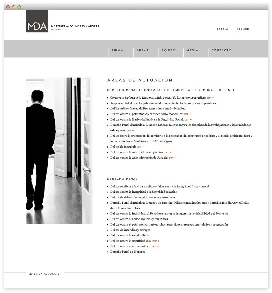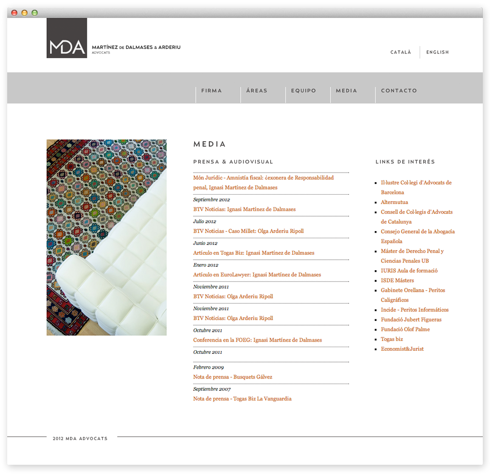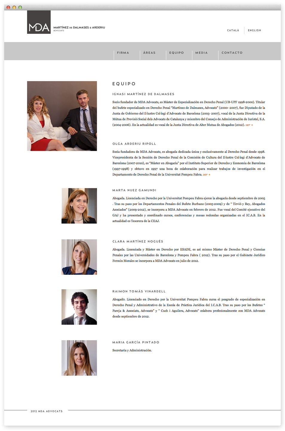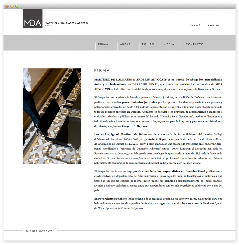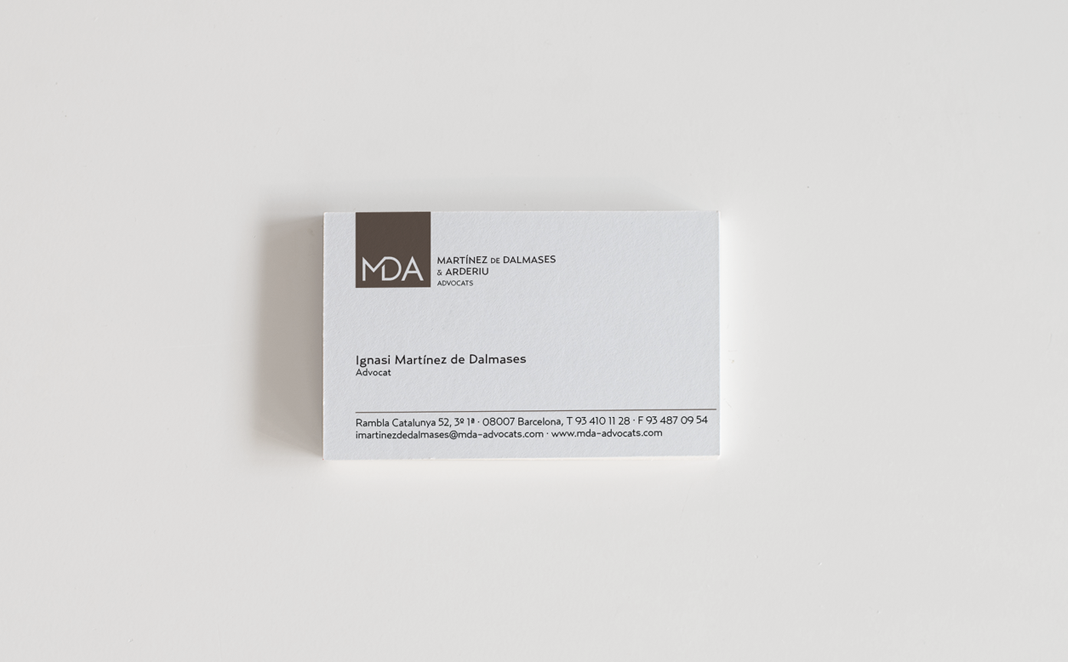 Disseny de imatge corporativa, targetes i papereria, web (disseny, programació i gestió de continguts) i fotografia corporativa per al bufet jurídic MDA Advocats.