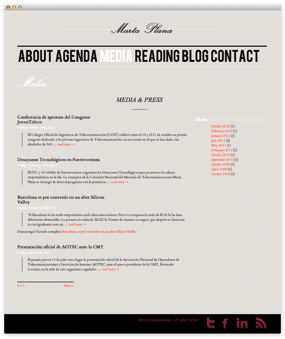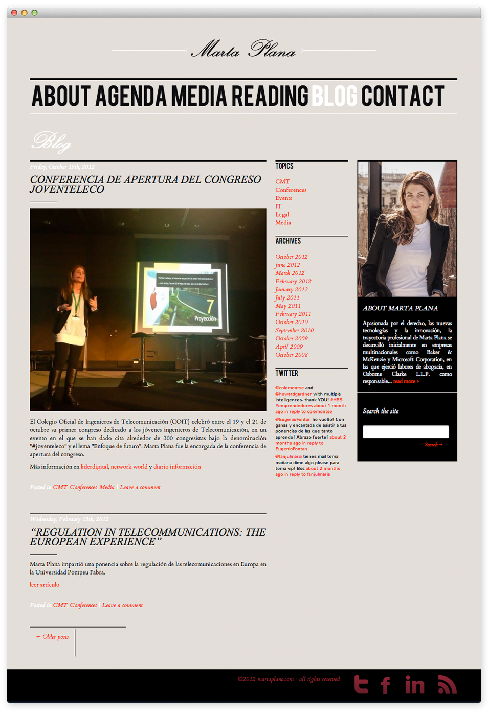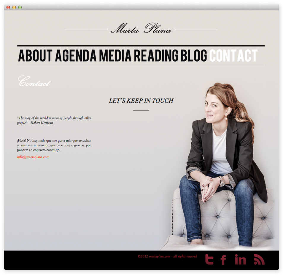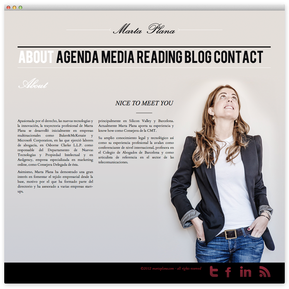 Personal website for Marta Plana, an IT lawyer: creative concept, web design and development, photo shoot, art direction, content management.